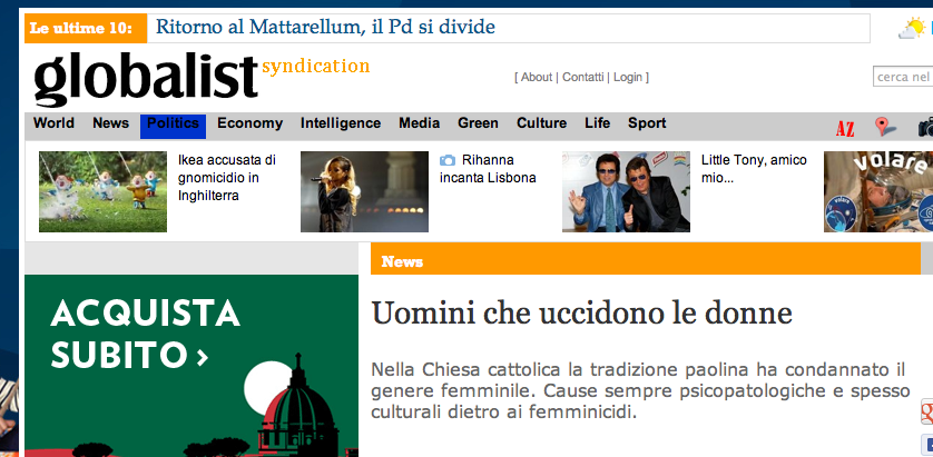 I Italien kampen för katoliker att tillämpningen av lagen om abort och support 40 det absurda i lagen om assisterad befruktning, förbud mot användning av preventivmedel, är strategier som syftar till att träffa kvinnans kropp, begränsar ” procreative sexuellt självbestämmande och frihet. När politik och vetenskap buga till kyrkan de bidrar till kampanjen för demonisering av kvinnligt kön: kvinnor inte bränns i bränderna som häxor efter ett sken av processen, men dödas av “inhemska inkvisitorer”, makar, sambor som fördömer och genomföra en implicit mandat i ett religiöst tänkesätt. Assassins of provision ens vet att de har det, och därför oförutsägbar och farlig eftersom de kan slå till var som helst och när som helst.