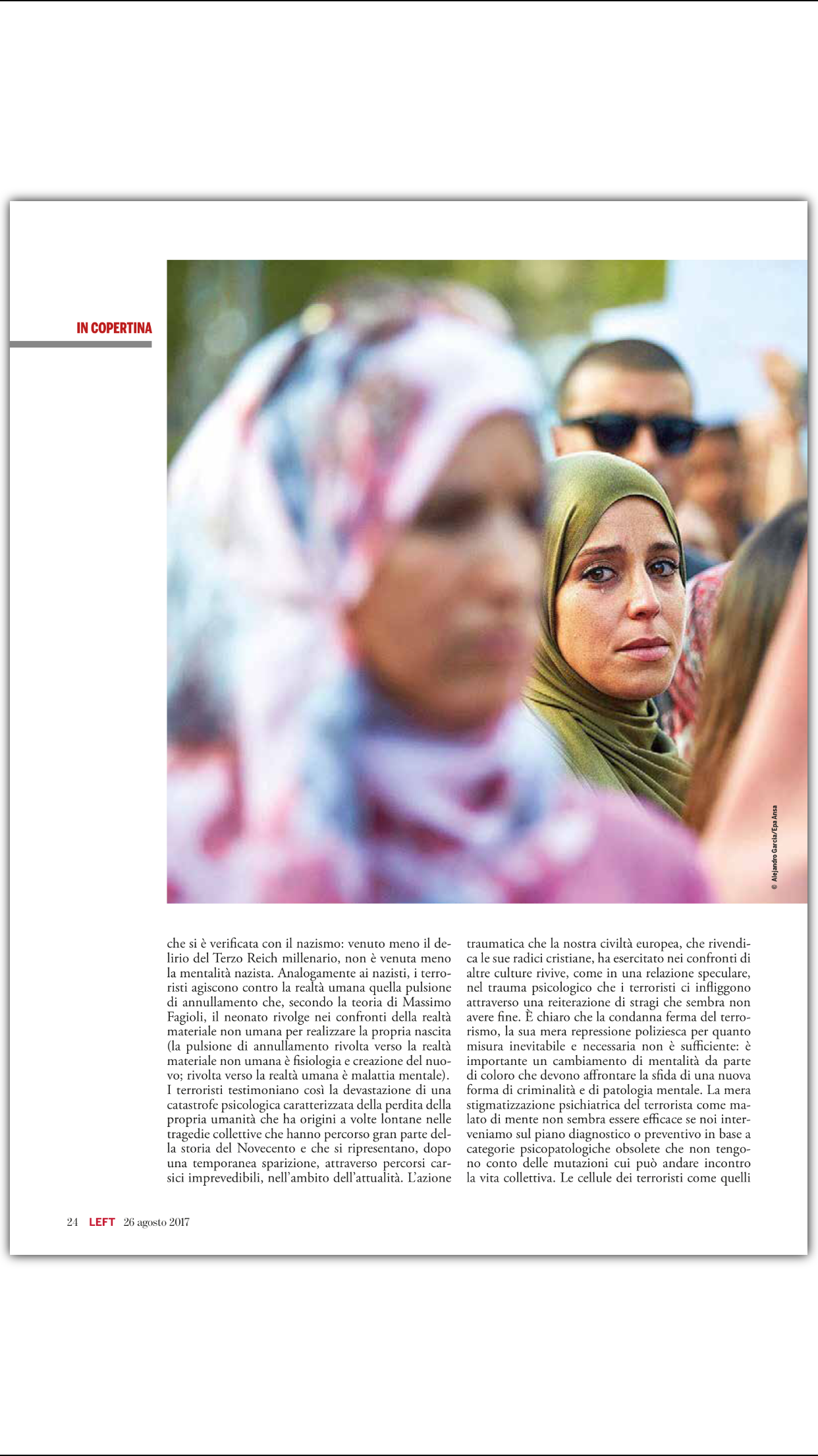 Il terrorismo e il “gruppo psicotico” : un’analisi originale della psicopatologia dei jihadisti di Domenico Fargnoli . Il termine gruppo psicotico rimanda a specifiche dinamiche di rapporto e alterazioni della vita psichica. La psicosi dei terroristi emerge per un processo di radicalizzazione, per cui la vita mentale del soggetto nel momento in cui si separa dalla famiglia originaria, subisce una brusca mutazione ( che ho già descritto in un precedente articolo) e per una adesione collettiva ad un delirio mistico-religioso condiviso. A ciò fa seguito un agire, motivato dal delirio, che apparentemente è criminale ma può essere considerato schizofrenico per il suo carattere totalmente antiumano. Questi tre elementi, radicalizzazione in determinati ambiti socio-culturali, condivisione del delirio, agire pseudocriminale sono indispensabili per caratterizzare il gruppo psicotico.