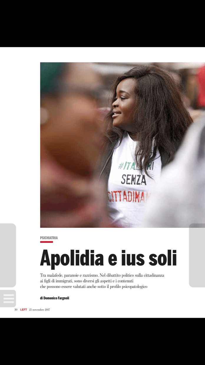 L’apolidia ha colpito non solo gli armeni scampati allo sterminio dei giovani turchi, i milioni di profughi russi dopo la rivoluzione di Ottobre ai quali veniva, con un decreto del 1921, tolta la cittadinanza dai Soviet ma anche coloro che successivamente sono incappati nelle politiche di revoca della naturalizzazione attuata da molti Stati europei negli anni 30 con in testa la Germania nazista. Il fenomeno dell’apolidia cioè la cancellazione della capacità giuridica di un soggetto da parte dello stato è tutt’ora attuale: [ vedi la proposta di Hollande di privare i terroristi dello stato giuridico] esso rientra in una strategia politica di annullamento dell’identità umana rivolta verso minoranze etniche o avversari politici. Prima di essere deportati nei lager agli ebrei tedeschi e non tedeschi veniva tolta la cittadinanza: lo stesso avviene oggi per i terroristi a Guantanamo. Si potrebbe misurare il grado d’infezione totalitaria di un governo dall’uso fatto della privazione della cittadinanza, scrisse Hannah Arendt. L’apolide è reso invisibile, inesistente e non può godere dei suoi diritti fondamentali. L’articolo 3 della costituzione italiana sancisce che tutti i cittadini sono uguali di fronte alla legge. Chi non è riconosciuto come cittadino non è considerato però uguale agli altri. È la nascita ad essere uguale per tutti: è quanto affermava nella sua teoria lo psichiatra Massimo nFagioli. Il bambino che nasce da genitori magrebini nello stesso ospedale in cui nasce un bambino da genitori Italiani ha gli stessi diritti di quest’ultimo. Come stabilisce il codice civile la capacità giuridica, cioè la titolarità di tutti i diritti si acquisisce alla nascita: ciò equivale a sostenere che i diritti , anche quello di cittadinanza ( garantito dall’art.15 della Dichiarazione universale dei diritti dell’uomo del 1948) hanno un fondamento che non può essere concesso o revocato da chicchessia, avendo le sue radici nel primo anno di vita, nei primi istanti della nostra esistenza. Lo stato italiano che ancora non riconosce lo ius soli condanna un milione di giovani ad una condizione simile a quella dell’apolidia de facto: essi vengono privati del diritto “naturale” di cittadinanza italiana in ossequio ad una forma di razzismo che si cela dietro l’adozione dello ius sanguinis o dello ius culturae: non si riconosce che l’identità di ciascuno di noi si lega alla nascita cioè ad un atto creativo autonomo del neonato che fa emergere la realtà mentale da quella biologica. La creatività e l’identità del bambino non dipende dal padre o dalla madre( cioè dallo ius sanguinis) o dall’appartenenza ad una cultura (cioè dallo ius culturae) ma è una caratteristica originaria e universale di tutta la specie umana. (Questa impostazione va oltre le rivendicazioni dell’indipendentismo di stampo romantico e oltre le politiche multiculturaliste che ghettizzano le differenze etniche.)