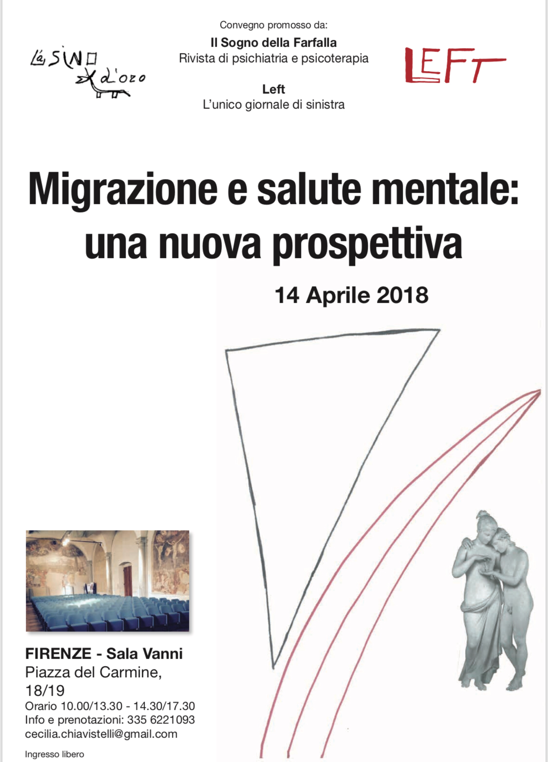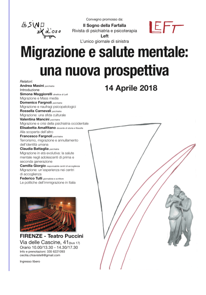La rivista di psichiatria e psicoterapia “Il sogno della farfalla””, in occasione dell’uscita del suo secondo numero del 2018 dedicato al tema della migrazione, unitamente al settimanale “Left” organizza il convegno “Migrazione e salute mentale: una nuova prospettiva” che si terrà il giorno 14/04/2018 a Firenze, nella storica sala Vanni in Piazza del Carmine 18. L’intento degli organizzatori è quello di promuovere una riflessione multidisciplinare su di una tematica che è centrale nell’attuale panorama non solo politico culturale ma scientifico: all’incontro parteciperanno psichiatri, giornalisti, politologi, operatori sociali che si sono occupati della migrazione non solo da un punto di vista teorico generale o dell’attualità ma anche da quello clinico e pratico della gestione dei problemi concreti connessi all’accoglienza. In particolare la ricerca psichiatrica può dare un contributo sostanziale alla conoscenza delle dinamiche psichiche implicite nell’ inevitabile ridefinizione della propria identità nei paesi di arrivo e nell’individuare le più opportune strategie terapeutiche qualora ci si trovi di fronte a derive psicopatologiche: è necessaria però in via preliminare una rassegna critica dei contributi storicamente delineatisi in tema di etnopsichiatria e di psicopatologia della migrazione. Il grande ingresso verificatosi nel nostro paese, negli ultimi decenni, di popolazioni derivanti da culture diverse dalla nostra costringe tutti, non solo gli operatori della salute mentale, a mettere in discussione i pregiudizi ideologici che hanno distorto la comprensione della natura del fenomeno migratorio, stimolando un’ allerta sociale non sempre giustificata e un’eccessiva preoccupazione per i problemi della sicurezza.