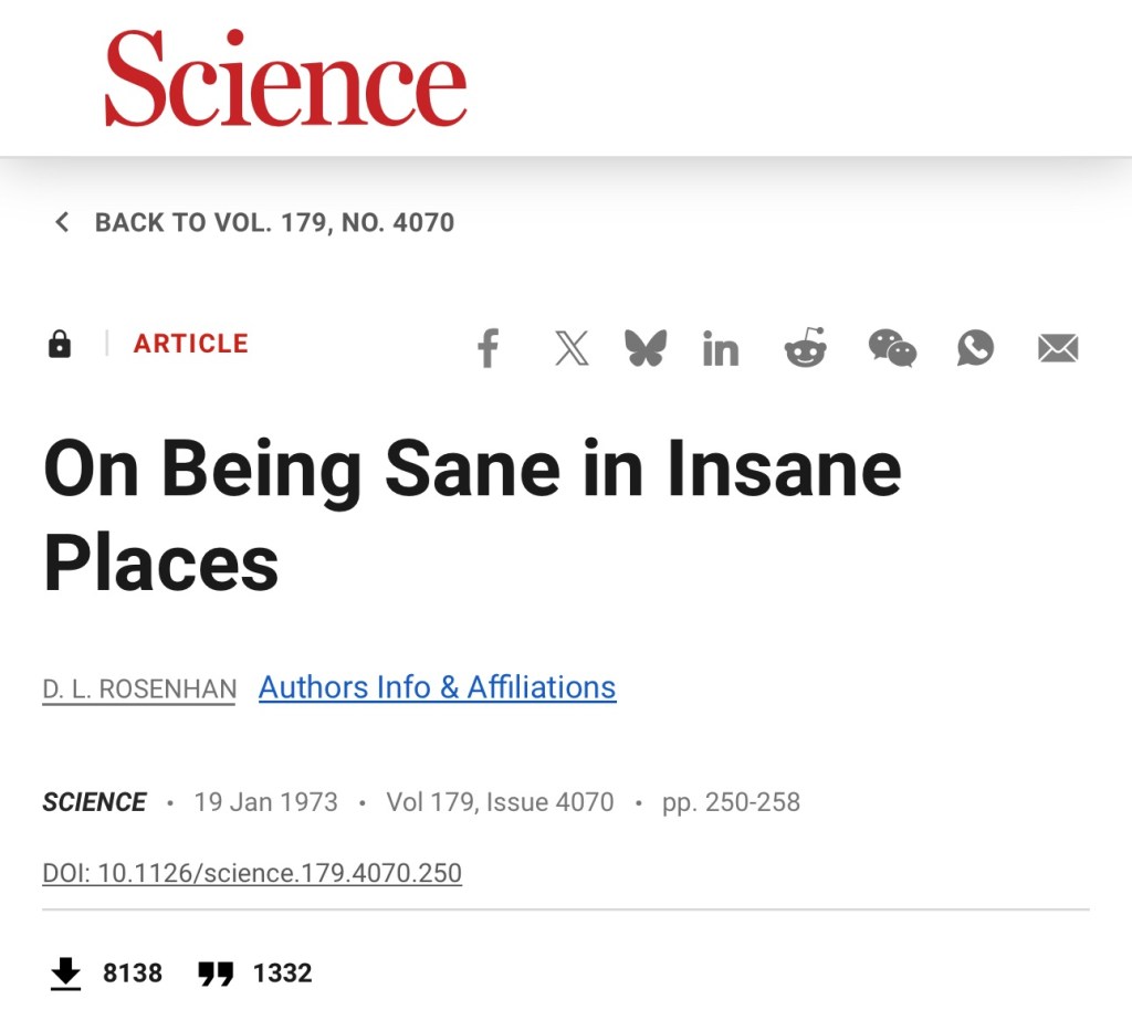 Nel 1973 lo psicologo statunitense David L. Rosenhan pubblicò sulla rivista Science uno studio divenuto celebre con il titolo On Being Sane in Insane Places (tradotto in italiano: “Sull’esser sani in luoghi folli”). Questo esperimento pionieristico metteva alla prova la validità delle diagnosi psichiatriche inviando persone sane sotto copertura in ospedali psichiatrici. Lo studio è considerato una critica importante e influente alla psichiatria dell’epoca, in quanto metteva in discussione la capacità dei medici di distinguere il sano dal malato mentale
