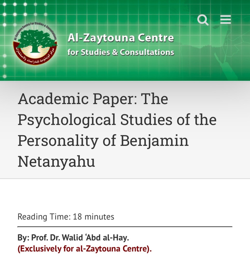 “La profondità della convinzione di Netanyahu nella prospettiva darwiniana può spiegare la sua convinzione che la maggioranza degli arabi, compresi quelli dei territori occupati nel 1948, rappresenti una minaccia esistenziale per Israele. Questa idea (la minaccia esistenziale) si è persino estesa a includere i pilastri dell’intero mondo. È una delle idee più frequentemente ripetute, in base all’analisi dei suoi discorsi, delle sue dichiarazioni e dei suoi scritti.