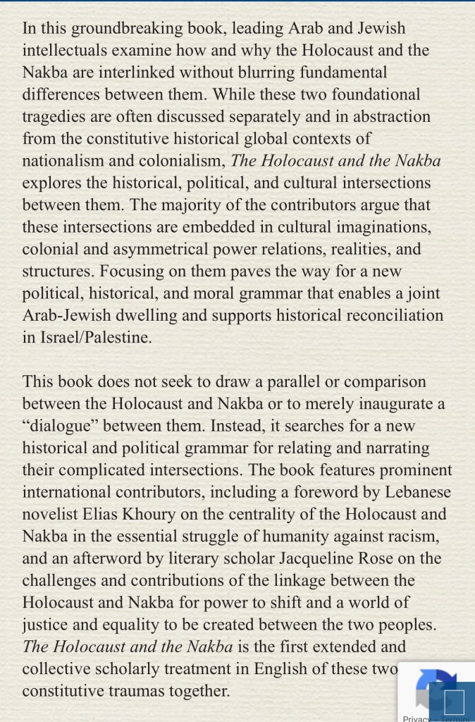 Questo libro non intende tracciare un parallelo né stabilire un confronto tra la Shoah e la Nakba, né semplicemente inaugurare un “dialogo” tra le due. Piuttosto, cerca una nuova grammatica storica e politica per mettere in relazione e narrare le loro complesse intersezioni. Il libro presenta autorevoli contributi internazionali, inclusa una prefazione del romanziere libanese Elias Khoury sulla centralità della Shoah e della Nakba nella lotta essenziale dell’umanità contro il razzismo, e una postfazione della studiosa letteraria Jacqueline Rose sulle sfide e i contributi del legame tra Shoah e Nakba nel promuovere un mondo di giustizia ed eguaglianza da costruire tra i due popoli. The Holocaust and the Nakba è il primo studio collettivo esteso e approfondito in lingua inglese che tratta insieme questi due traumi fondativi.