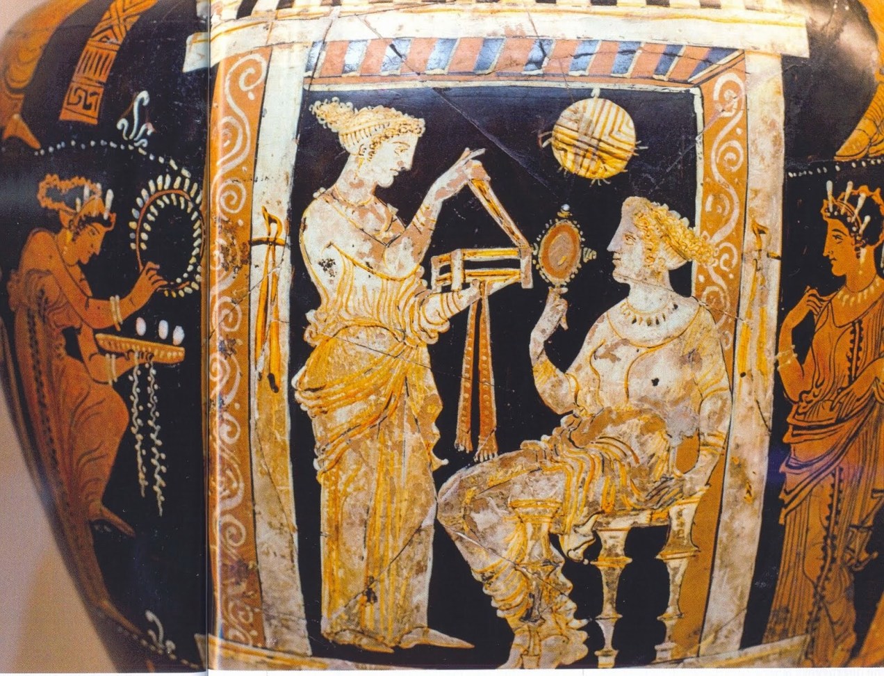 Nell’antica Grecia lo specchio era un attributo femminile e non era associato alla conoscenza di se stessi. Nella misura in cui l’identità riguardava solo l’individuo razionale ai maschi era interdetto l’uso dello specchio, riservato alle donne esseri irrazionali come i bambini e quindi non pienamente umani. Lo specchio era formalmente interdetto anche al giovane efebo, il pais oggetto dell’omosessualità maschile. Solo nell’amante il pais come in uno specchio troverà l’immagine del reciproco amore. Anche per Platone lo specchio maschile e’ quello dello sguardo di un altro uomo, quello del simile e dell’uguale come Socrate che si ammirava in Alcibiade e Alcibiade in Socrate. Il rimando, la riflessione speculare per Platone e Socrate e’ quella della razionalita’ e della coscienza mentre per la donna la scoperta del proprio volto e’ un processo irrazionale, non cosciente attraverso il quale essa definisce la propria diversità’ e irriducibilita’ al logos maschile.